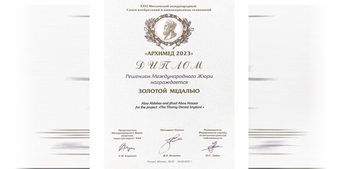 ونال الميدالية كل من الأستاذ الدكتور جهاد أبو نصار والباحثة الدكتورة آلاء الدبس عن اختراعهما الذي شاركا به في المعرض تحت عنوان “الزرعة السنية الشوكية”.