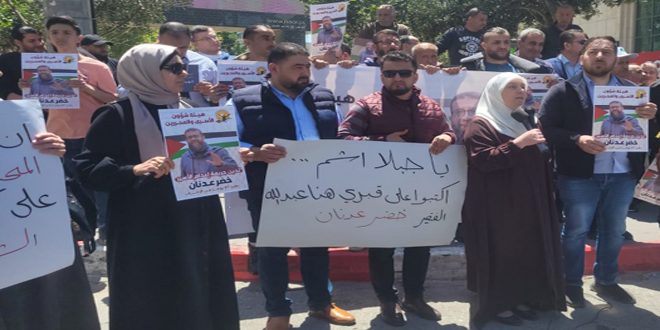 وذكرت وكالة وفا الفلسطينية أن المشاركين في الوقفة التي دعا إليها نادي الأسير وهيئة شؤون الأسرى والمحررين والقوى الوطنية الفلسطينية أمام مقر اللجنة الدولية للصليب الأحمر في المدينة، رفعوا صور الشهيد عدنان والأسير المريض المصاب بالسرطان وليد دقة ولافتات كتب عليها شعارات تندد بجرائم الاحتلال، وتطالب بالإفراج الفوري عن الأسرى، وخاصة المرضى منهم وباسترداد جثامين الشهداء المحتجزة لدى سلطات الاحتلال ومن بينها جثمان عدنان وجثامين 12 أسيراً آخرين.