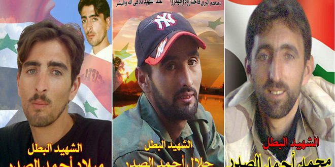 ومع استمرار الحرب على الإرهاب التحق محمد شقيق الشهيدين ميلاد وجلال في صفوف القوات الرديفة، ليتابع الطريق الذي أناره ورسمه الشهداء بدمائهم الطاهرة وارتقى شهيداً في أيار 2014 بمنطقة كسب في اللاذقية.. لقد كان وقع خبر رحيل ابنها البكر محمد قاسياً وصعباً على أم محمد.. “كدت أفقد عقلي من الحزن، ولكن الله منحني الصبر.. بكيت قهراً وأوجعني رحيلهم الباكر فوالدهم المتقاعد أنهكه الحزن ولكن الذي يبعث في نفسي الرضا والأمل أن أولادهم يكبرون بعزة وكرامة، فدماء الشهداء لن تذهب سدى بل صنعت النصر وأرواحهم تحرسنا من كل غدر”.