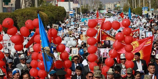 وذكر موقع (RT) أن مسيرة الفوج الخالد التي تنظم الاحتفال بيوم النصر خرجت في بشكيك عاصمة قرغيزستان بمشاركة أكثر من 10 آلاف شخص، فيما شهدت عواصم أقاليم البلاد أيضاً مسيرات مشابهة.
