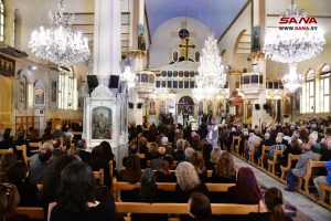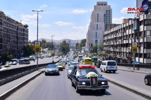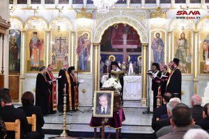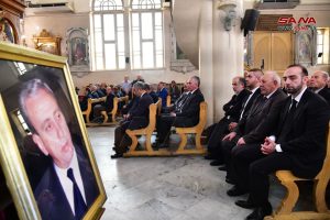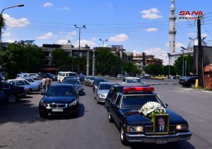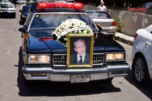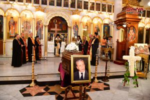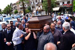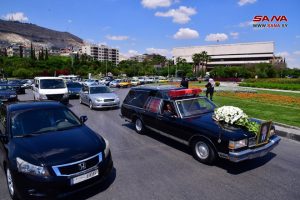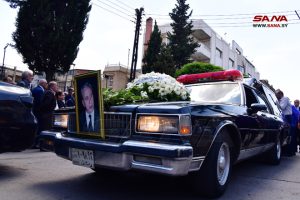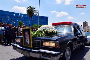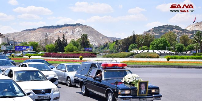 موكب التشييع انطلق من مشفى الشامي مروراً بمبنى الإذاعة والتلفزيون ليوارى الثرى عقب الصلاة على جثمانه في كنيسة الصليب بحي القصاع.