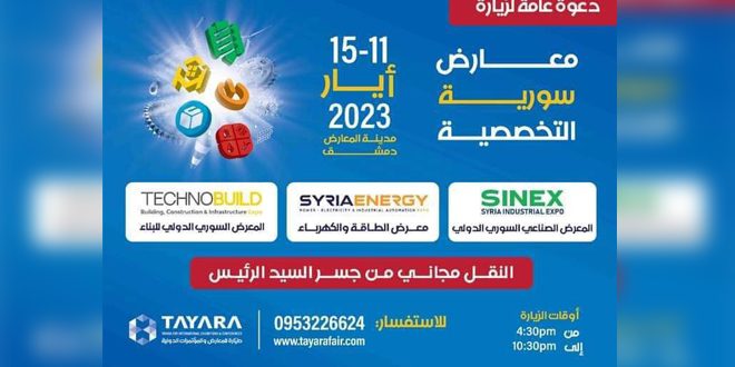 بمشاركة نحو 150 شركة محلية وعربية وأجنبية تنطلق مساء الخميس القادم سلسلة معارض سورية التخصصية التي تضم معرض الطاقة والكهرباء والأتمتة الصناعية “سيريا إنيرجي” والمعرض الصناعي السوري الدولي “سينكس” والمعرض السوري الدولي للبناء والتشييد والبنى التحتية “تيكوبيلد”.