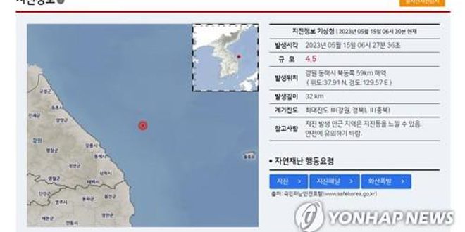 ونقلت وكالة يونهاب عن الأرصاد الجوية الكورية الجنوبية قولها اليوم في بيان: إن الهزة حدثت في المياه على بعد 52 كيلومتراً شمال شرق دونغهيه وعند خط عرض 37.99 درجة شمالاً، وخط طول 129.72 درجة شرقاً على عمق 32 كيلومتراً.