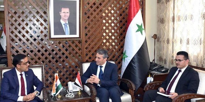 بحث وزير الصناعة الدكتور عبد القادر جوخدار مع القائم بأعمال سفارة الهند بدمشق فيجاي باندي تعزيز علاقات التعاون المشترك التي تربط بين سورية والهند في مختلف المجالات الصناعية والاقتصادية.