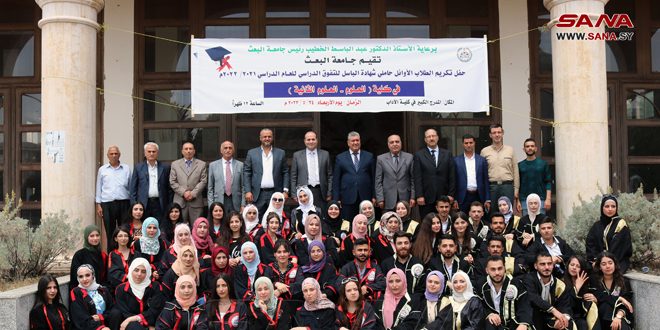 كرمت جامعة البعث في حمص اليوم الطلاب الأوائل حاملي شهادة الباسل للتفوق في كليتي العلوم الأولى والثانية للعام الدراسي 2021- 2022، والبالغ عددهم 52 طالباً وطالبة، وذلك على المدرج الكبير في كلية الآداب والعلوم الإنسانية.