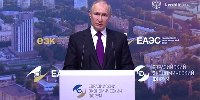 وقال بوتين خلال انطلاق أعمال المنتدى الاقتصادي الأوراسي اليوم تحت شعار “التكامل الأوراسي في عالم متعدد الأقطاب”: “إن حجم المشاركة في المنتدى الاقتصادي الأوراسي يجسد أهمية الاتحاد الأوراسي في العالم الراهن، فجميع الدول المشاركة فيه تسعى لعلاقات متوازنة تعتمد على مبدأ المصالح المتبادلة”.