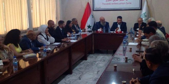 التقى رئيس اتحاد الكتاب العرب الدكتور محمد الحوراني اليوم وفد الجبهة الأوروبية للدفاع عن سورية “حزب كازا باوند الإيطالي”، وذلك في مقر الاتحاد بدمشق.