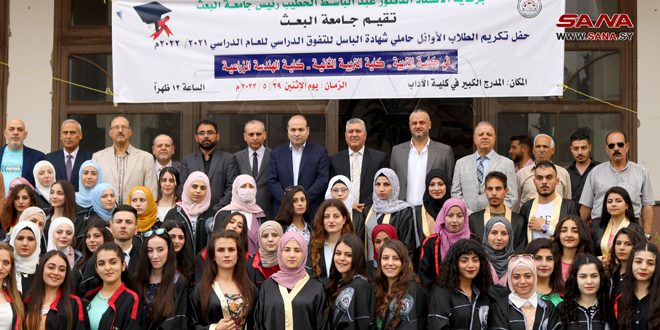 كرمت جامعة البعث في حمص اليوم 75 طالباً وطالبة من أوائل حاملي شهادة الباسل للتفوق في كليات التربية والتربية الثانية والزراعة، للعام الدراسي 2021- 2022، وذلك على المدرج الكبير في كلية الآداب والعلوم الإنسانية.