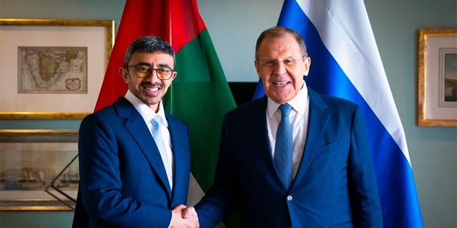 ووفق موقع آر تي استعرض لافروف وابن زايد خلال لقائهما أمس على هامش اجتماع وزراء خارجية دول مجموعة بريكس في كيب تاون بجنوب إفريقيا، عدداً من الملفات المرتبطة بجدول أعمال الاجتماع، وبحثا المستجدات على الساحتين الإقليمية والدولية، وتبادلا وجهات النظر بشأنها.