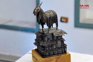 واعتمدت الفنانة التشكيلية يسرى محمد في منحوتتها أيضاً على الخشب ولكن خشب الليمون الذي يضيف بحسب تعبيرها تميزاً لونياً طبيعياً، مبينة أن فكرة عملها استوحتها من عنفوان الحصان.