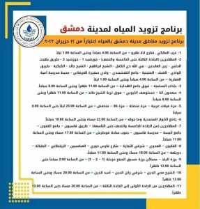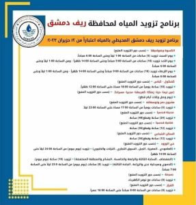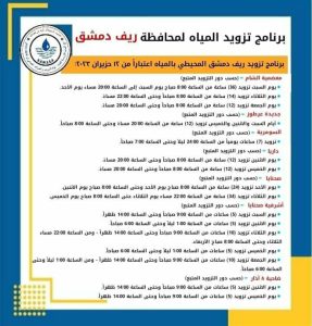2023-06-12دمشق-ساناأعلنت المؤسسة العامة لمياه الشرب والصرف الصحي في محافظة دمشق عن برنامج تزويد مدينة دمشق وريفها بالمياه اعتباراً من اليوم وفق الآتي : مياه دمشق 2023-06-12sana