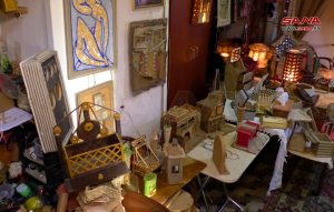 ترجم سمير رحمون قصة عشقه لدمشق عبر تحف شكلها بيده بتقنية إعادة التدوير، فصنعها على شكل نوافذ وشرفات وأبواب خشبية، إضافة للطاولات والنوافير.