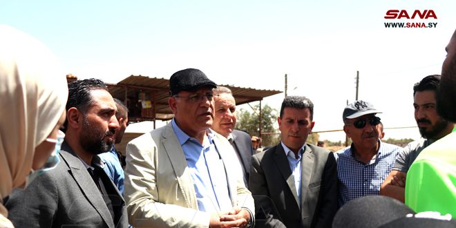 وجال الوزير على بعض مزارع تربية الخيول العربية الأصيلة والأبقار والعجول والأغنام في مدينة درعا ومزارع البطاطا والحمص والبندورة والبطيخ الأحمر والأشجار المثمرة في ريف المحافظة بالأراضي التابعة لبلدة خربة غزالة، واستمع من المربين والمزارعين حول مشاكلهم وخاصة في مجال تأمين الأعلاف والمحروقات لمصلحة عمليات السقاية والري وترخيص الآبار الزراعية.