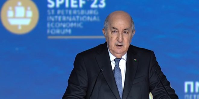 وقال تبون في كلمة أمام الجلسة العامة لمنتدى سان بطرسبورغ الاقتصادي الدولي اليوم: إن الجزائر تشهد مرحلة تنموية مهمة، وأصبحت وجهة استثمار واعد بسبب محفزات الاستثمار، داعياً المستثمرين لاكتشاف بيئة الأعمال والمحفزات الاقتصادية الجديدة.