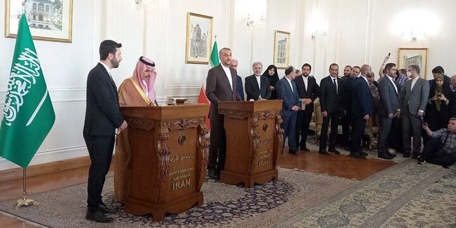 وقال عبد اللهيان في مؤتمر صحفي مشترك مع بن فرحان: “متفقون على أهمية تشكيل لجان سياسية واقتصادية وحدودية مشتركة، وسنمضي قدماً باتجاه التنفيذ عقب تصديق التوافقات من قبل قادة البلدين”.