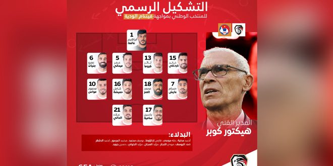 أعلن المدير الفني لمنتخب سورية الأول بكرة القدم هيكتور كوبر التشكيلة التي سيخوض بها منتخبنا مباراته الودية، مع نظيره الفيتنامي في وقت لاحق اليوم على ستاد تيان ترونغ في مدينة نام دنه الفيتنامية.