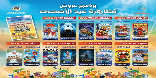 تستعد المؤسسة العامة للسينما لإطلاق تظاهرة عروض أفلام عيد الأضحى في صالات سينما الكندي في جميع المحافظات.