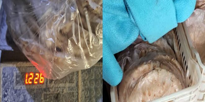 وآخر بمخبز بريف جبلة بمخالفة نقص نحو 20 كيساً من مخصصات الدقيق والتصرف بها بطريقة غير مشروعة وتغريم المخالف بمبلغ 8918000 ل.س، إضافة إلى ضبط مخبز البريد بمخالفة نقص وزن ربطة الخبز وتغريم المخالف بمبلغ 1180000 ل.س.