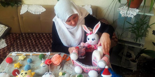 بمهارتها اليدوية… تطوع الشابة نوف الحسين خيوط الكليم والصوف على سنارتها، لتجعل منها قطعاً ووسائل قابلة للاستخدام والاقتناء ضمن مشروعها متناهي الصغر في محافظة السويداء.