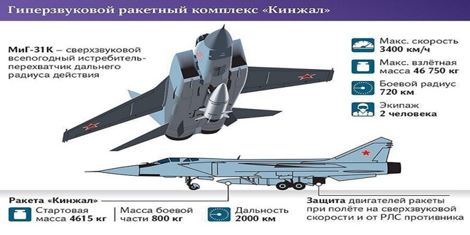 يذكر أن صاروخ كينجال الفرط صوتي يطلق إلى مسافة 2000 كيلومتر ووزنه عند إطلاقه من طائرة ميغ 31 يصل 4615 كيلوغراماً ووزن رأسه القتالية 800 كيلوغراماً وسرعته نحو 12000 كلم/ساعة.