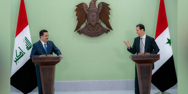 وقال الرئيس الأسد خلال المؤتمر: “أرحب بالسيد رئيس الوزراء محمد شياع السوداني والوفد الرسمي المرافق له والوفد الإعلامي ووسائل الإعلام الوطنية العراقية.. أرحب بكم جميعا في سورية، في هذه الزيارة الهامة التي تأتي أهميتها من طبيعة العلاقات العميقة بين الشعبين السوري والعراقي، ومن عمق التاريخ المشترك بين البلدين، التاريخ الأقدم والأعرق على الإطلاق في العالم”.