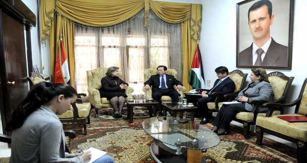 زار اليوم سفير جمهورية كوريا الديمقراطية الشعبية بدمشق جانغ ميونغ هو وأعضاء السفارة ترافقهم فعاليات حزبية ورسمية ضريح القائد الخالد حافظ الأسد ووضع أكليلا من الزهور على الضريح.