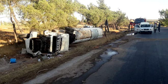تدهور اليوم صهريج محمل بمادة الغاز على الطريق الدولي بين حمص ودمشق بالقرب من تحويلة طرطوس.