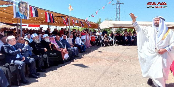 وتضمنت الفعالية التي بدأت بوضع أكاليل من الزهور على النصب التذكاري للشهداء وقراءة الفاتحة على أرواحهم الطاهرة تقديم لوحات فلكلورية لفرقة شهرزاد السورية تعكس بعضاً من التقاليد والقيم النضالية والكفاحية المتجذرة، للذود عن أرض الوطن لتبقى رايته خفاقة.