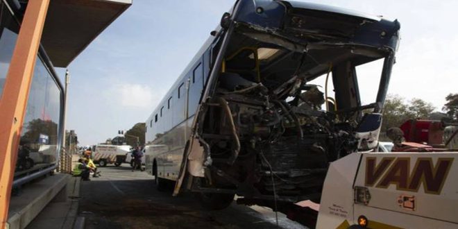 أصيب 77 شخصاً، اثنان منهم في حالة حرجة إثر اصطدام حافلتين عند مدخل جامعة في جنوب أفريقيا اليوم.
