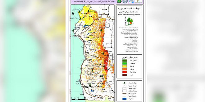 وبينت المنصة أنه يتم إعداد الخرائط في الهيئة العامة للاستشعار عن بعد بالتعاون مع وزارة الزراعة والإصلاح الزراعي- مديرية الحراج والمديرية العامة للأرصاد الجوية، داعية المواطنين إلى عدم إشعال النيران والإبلاغ عن أي نار أو دخان على الأرقام المجانية 188 و113.