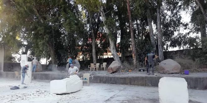يواصل نحو 11 فناناً من مختلف المحافظات أعمال تطويع الحجر البازلتي والتدمري لينطق بمفردات ومعان ومواضيع متنوعة، خلال ملتقى النحت الرابع الذي يقام في بلدة الحواش بريف حمص.