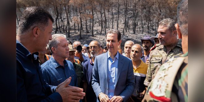 زار السيد الرئيس بشار الأسد غابات وأحراج ريف اللاذقية الشمالي التي تعرضت للحرائق خلال الأيام الماضية، وأكد أن الفرق التي قامت بإطفاء الحرائق قدمت نموذجاً للبسالة، فالمعركة ليست حرباً وسلاحاً فقط، بل هناك ما يوازيها بنفس الخطورة وربما أصعب.