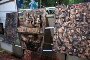 وفي جناح الفنان التشكيلي ماهر حفار تنوعت اللوحات بين الزيتية والخشبية والخزف والزجاج، وقال: “إن الإبداع فكرة تخلق كل يوم”، وهذا ما أراد إيصاله باعتماده على المواد البسيطة ليخلق لوحة فنية على كل ما يلمسه من فناجين وكؤوس وصوان وأثاث قديم.