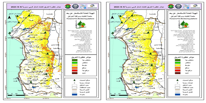 وأوضحت المنصة أنه يتم إعداد الخرائط في الهيئة العامة للاستشعار عن بعد بالتعاون مع وزارة الزراعة والإصلاح الزراعي- مديرية الحراج والمديرية العامة للأرصاد الجوية داعية جميع المواطنين إلى عدم إشعال النار والإبلاغ عن أي حريق عبر الاتصال على الأرقام المجانية 188 و113.