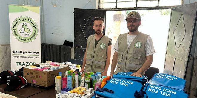 قدمت مؤسسة تآزر للتنمية مساعدات إنسانيةً وغذائيةً لنزلاء مركز ملاحظة الأحداث الجانحين، التابع لمديرية الشؤون الاجتماعية والعمل بحمص، شملت مواد غذائيةً وألبسةً ولوازم شخصيةً.