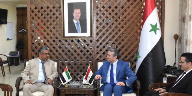 بحث وزير الصناعة الدكتور عبد القادر جوخدار مع القائم بأعمال سفارة دولة الإمارات في دمشق عبد الحكيم إبراهيم النعيمي مجالات التعاون الصناعي بين البلدين الشقيقين وتطويرها.