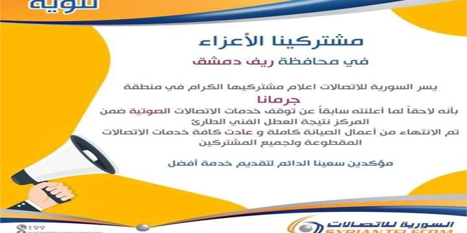 أعلنت الشركة السورية للاتصالات عودة كل خدمات الاتصالات لجميع مشتركيها في منطقة جرمانا الذين يخدمهم مركز هاتف جرمانا، وذلك بعد انقطاعها عنهم ظهر اليوم نتيجة عطل فني طارئ على تجهيزات المقسم.