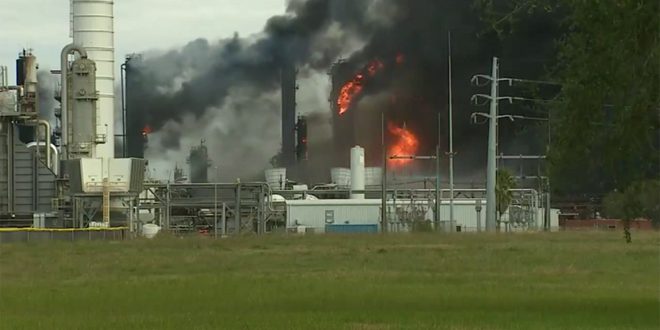 أدى اندلاع حريق هائل في مصفاة تكرير النفط في مدينة غاريفيل بولاية لويزيانا الأمريكية إلى إخلاء المنطقة كإجراء احترازي لوجود تسرب كيميائي.
