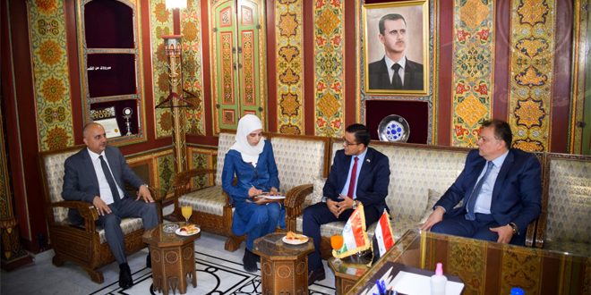 وعرض القائم بأعمال السفارة الهندية لعدد من الخدمات التي تقدمها سفارة بلاده بدمشق، من برامج التدريب وتمكين الكوادر والموظفين من خلال بعثات قصيرة الأمد إلى الهند تغطي كل الاختصاصات، بما يعزز التواصل وتبادل الخبرات، داعياً إلى المشاركة بالمعارض التي تقام في الهند، حتى تتمكن الشركات والفعاليات التجارية في البلدين من التواصل والتفاعل فيما بينها، والتعرف على فرص التعاون والاستثمار المتبادل.
