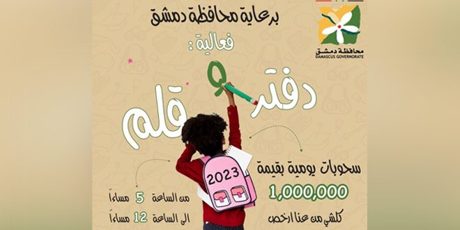 أعلنت محافظة دمشق عن افتتاح فعالية “دفتر وقلم” على أرض مدينة المعارض القديمة يوم غد الخميس الساعة الخامسة مساء.