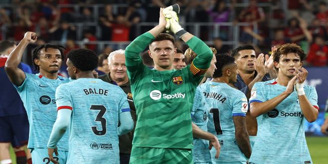 سجل روبرت ليفاندوفسكي هدفاً من ركلة جزاء متأخرة ليقود برشلونة لفوز صعب 2-1 في أوساسونا، وهو الانتصار الثالث على التوالي لحامل اللقب في دوري الدرجة الأولى الإسباني لكرة القدم اليوم.