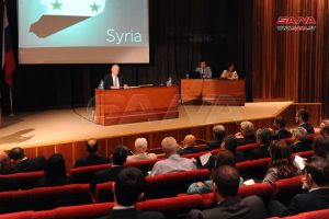 حضر الندوة السفير ميلاد عطية المندوب الدائم لسورية لدى منظمة حظر الأسلحة الكيميائية، ومدير عام هيئة الطاقة الذرية الدكتور إبراهيم عثمان، وعدد من أعضاء البعثة الدبلوماسية الروسية بدمشق، ومديرو الإدارات بوزارة الخارجية والمغتربين، وممثلو وسائل الإعلام الوطني، وعدد من المهتمين والباحثين.