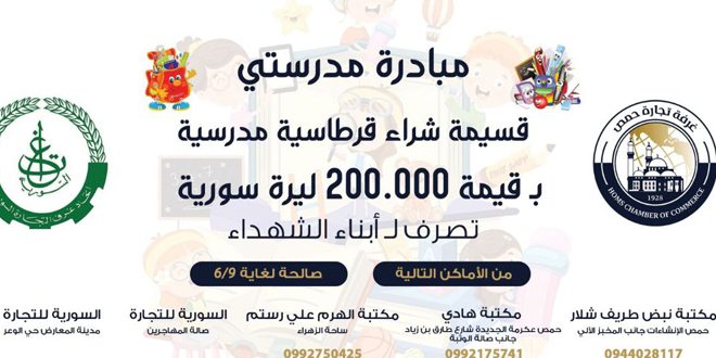 تعزيزاً لدورها الهادف في خدمة المجتمع أطلقت غرفة تجارة حمص مؤخراً مبادرة “مدرستي”، والتي تهدف لتوزيع القرطاسية على أبناء الشهداء لتخفيف الأعباء عليهم مع انطلاقة العام الدراسي الجديد.