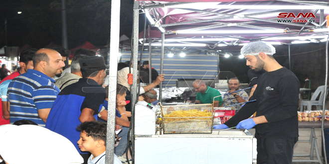 شارع المأكولات الذي أصبح ركناً أساسياً في معرض الزهور منذ ست سنوات، تتنوع الأطعمة فيه بين التراثية كخبز الصاج وغزل البنات المصنعة يدوياً والوجبات السريعة بأصنافها الشرقية والغربية، مع حرص الباعة على تقديمها للزوار بأسعار مناسبة، حيث بين لـ سانا بشار زبيدي صاحب مطعم أن مشاركته تسهم بتعريف زائري المعرض بما يقدمه محله من مأكولات شرقية وغربية ووجبات سريعة، وسط أجواء اجتماعية ممتعة، إضافة إلى توفير فرص عمل للشباب.
