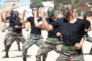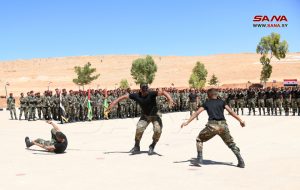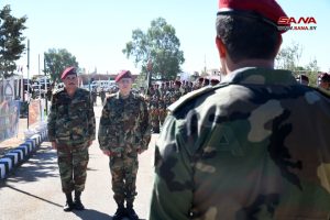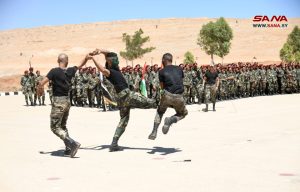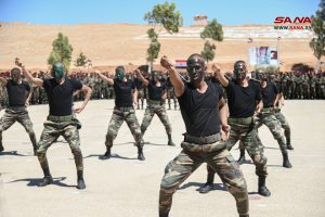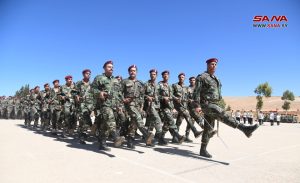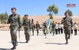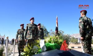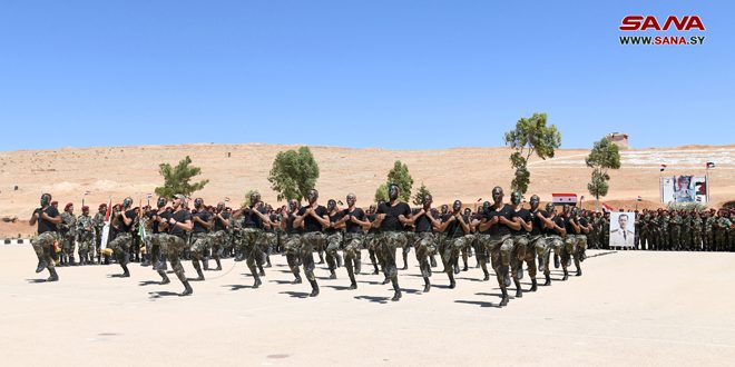 وتم خلال الاحتفال وضع إكليل من الزهور على النصب التذكاري لشهداء الدفاع عن سورية العروبة، كما تضمن الحفل عرضاً واستعراضاً للقوات وفقرات تجسد مهارات الرمي والقتال القريب ومسابقات رياضية.