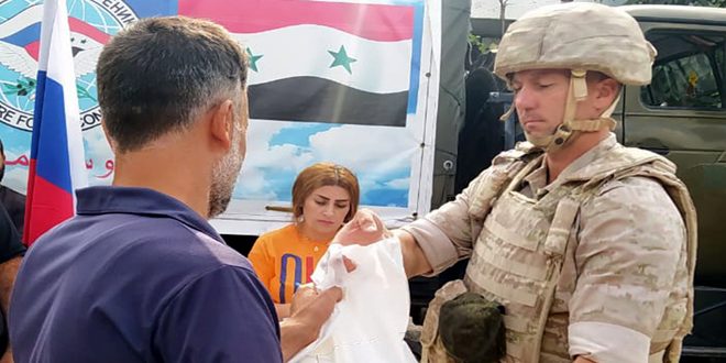 وأشار المقدم ليبيوخين أليكسي المسؤول عن توزيع المساعدات في تصريح لمراسلة سانا إلى أن المساعدات الغذائية المقدمة تقدر بنحو 3 أطنان وتحوي مواد الشاي والأرز والسكر والطحين والزيت.