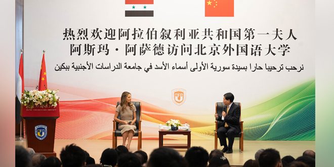 السيدة الأولى أسماء الأسد تجري لقاء حوارياً مع طلاب الدراسات العربية في جامعة الدراسات الأجنبية ببكين