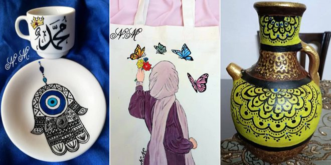 على الزجاج والأكواب والفناجين والقماش والكانسون والكانفاس والحقائب والفخار تنجز الشابة نسرين مصطفى ابنة مدينة اللاذقية أجمل اللوحات والرسومات والمطرزات، فعشقها الفطري للرسم أطلق لخيالها العنان على كل ما تقع عليه يداها، وكرّسته في قلوب ابنتيها، ودرسته للأطفال، ثم جسدته في مشروعٍ خاصٍ بها.