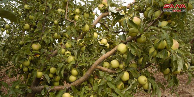 وأشار شهيب إلى أن إجمالي المساحات المزروعة بالتفاح للموسم الحالي بلغ نحو 16038 هكتاراً تحوي 3.467 ملايين شجرة يشكل المثمر منها 2 مليون و876 ألف شجرة، مبيناً أن أغلبيتها هي من أنواع ستاركن وغولدن التي تمتاز ثمارها بلون مميز وصلابة تجعل قوامها متماسكاً وتعطيها قدرة تخزينية لفترة طويلة.