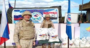 وزع مركز التنسيق الروسي في حميميم اليوم ثلاثة أطنان من المساعدات الغذائية الإنسانية على أهالي قرية عين بالوج في ريف طرطوس.